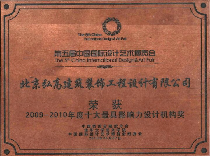 北(běi)京弘高建築裝飾工(gōng)程設計有限公司榮獲2009-2010年度十大(dà)最具影響力設計機構獎