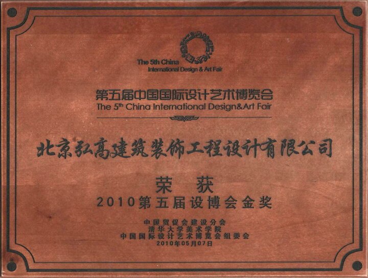 北(běi)京弘高建築裝飾工(gōng)程設計有限公司榮獲2010第五屆社博會金獎