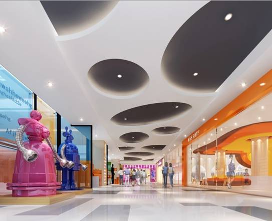 流光溢彩的吊頂設計更是給人以無限的遐想,明亮的顔色仿佛讓自己置身于星光大(dà)道中(zhōng)。頂面色塊不僅不會帶給人壓抑感,反而營造出一(yī)種清新明快的感覺。商(shāng)場裏的所有顔色都是那麽夢幻 、美好,讓人忘記所有煩惱,無論是大(dà)人還是孩子,都沉浸在這夢幻的世界裏享受這美好的一(yī)切。不僅如此,所有的材料全部采用環保材料,家長可以放(fàng)心的讓孩子在這裏嬉戲玩耍。