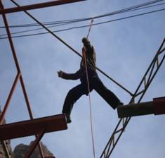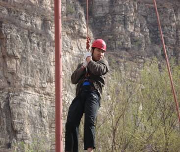 第二天一(yī)早,7點準時集合,大(dà)家一(yī)起早操和早餐後,開(kāi)始了拓展正式的課程。第一(yī)個項目是空中(zhōng)斷橋,八米多高的空中(zhōng)有一(yī)個木橋,可是中(zhōng)間有近一(yī)米的斷開(kāi),需要每個人從斷橋上邁過去(qù)再邁回來,之後從斷橋中(zhōng)間被保護繩吊着速降下(xià)來。這個項目對個人是一(yī)種挑戰,要戰勝自己對高空的恐懼,挑戰自己的自信。所以這個項目 就是所謂的“斷橋一(yī)小(xiǎo)步,人生(shēng)一(yī)大(dà)步”。經過近兩個小(xiǎo)時的活動,團隊中(zhōng)除了一(yī)個有傷不能參加這項活動之外(wài),所有的人都進行了對自己的挑戰,而且金鑫、楊鵬遠、張彩馨等團隊成員(yuán)還進行了兩次挑戰,挑戰了自己前一(yī)次的成績,也取得了比前一(yī)次更好地成績和效果。