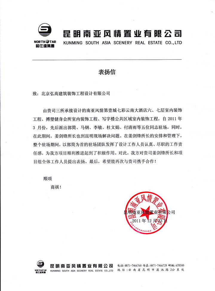 昆明南(nán)亞風情七彩雲南(nán)大(dà)酒店(diàn)表揚信