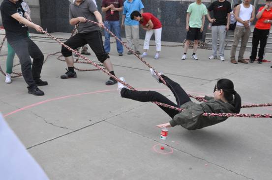 第二個遊戲叫狼群取暖,所有隊員(yuán)戴着眼罩圍成一(yī)圈,并肩向前邁三步,最後擠在一(yī)起。最後一(yī)步走完,隊員(yuán)們不知(zhī)道自己站在哪裏,又(yòu)被擠出來的有被擠進去(qù)的,圓圈斷開(kāi),很多隊員(yuán)摔倒在地,這項活動使大(dà)家開(kāi)懷大(dà)笑,煩惱盡消,促進團隊的融洽。