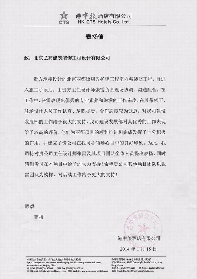 港中(zhōng)旅酒店(diàn)有限公司表揚信